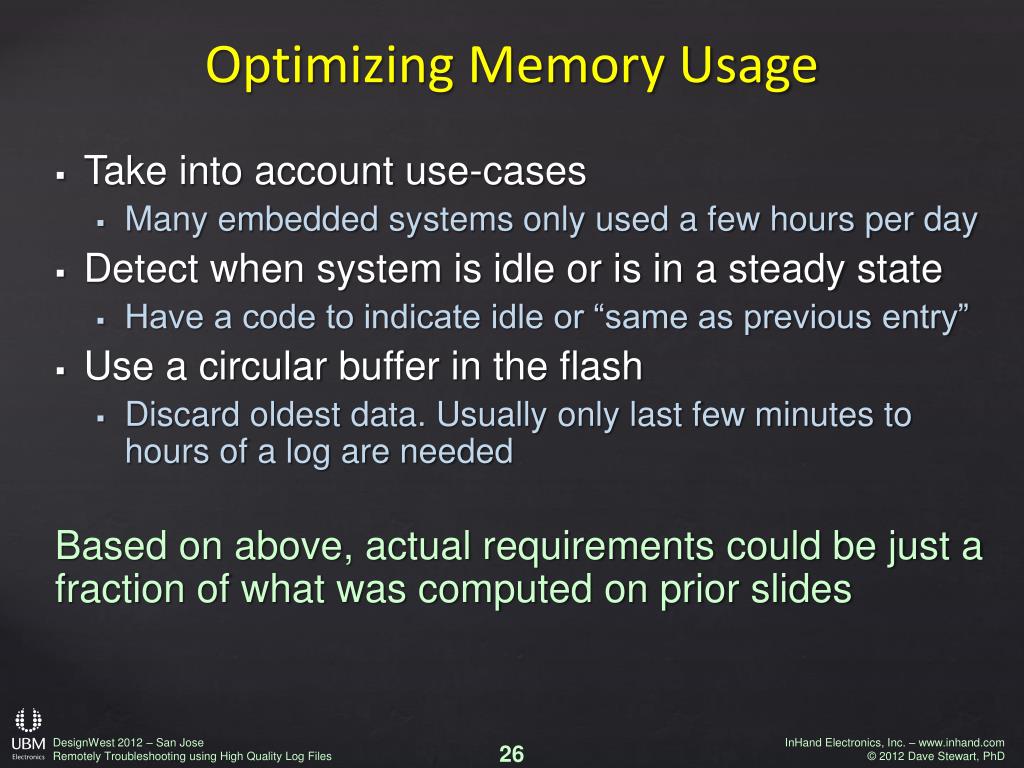 Optimizing Memory Usage • Take into account use-cases • Many embedded systems only used a few hours per day • Detect when system is idle or is in a steady state • Have a code to indicate idle or “same as previous entry” • Use a circular buffer in the flash • Discard oldest data. Usually only last few minutes to hours of a log are needed Based on above, actual requirements could be just a fraction of what was computed on prior slides