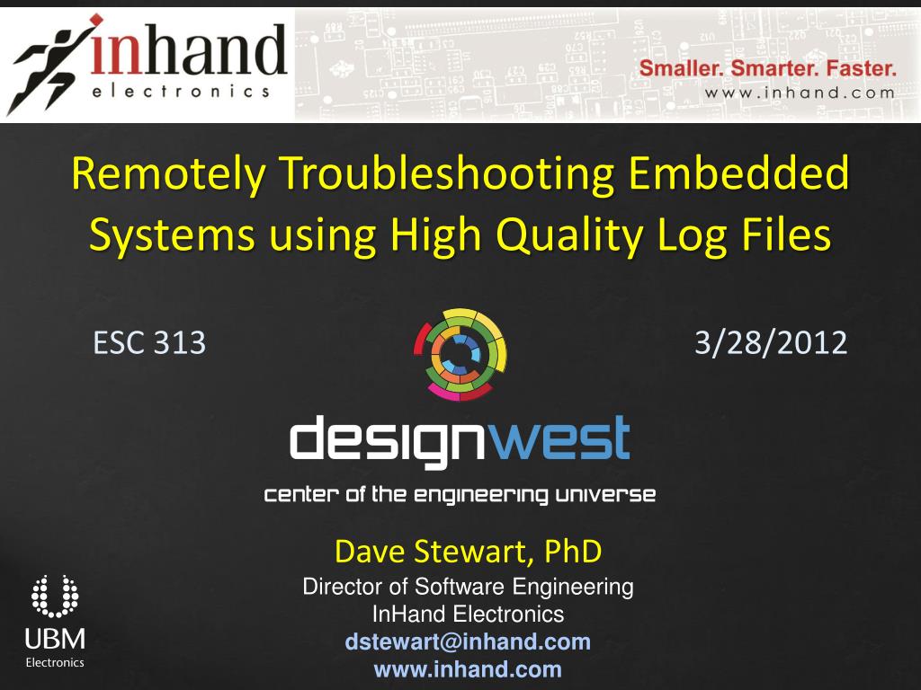 Remotely Troubleshooting Embedded Systems using High Quality Log Files ESC 313 3/28/2012 Dave Stewart, PhD Director of Software Engineering InHand Electronics dstewart@inhand.comwww.inhand.com
