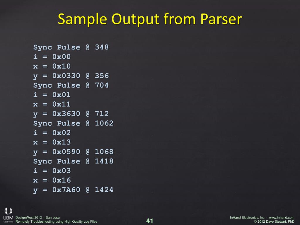 Run code to produce log file • File produced is binary. Here is sample hexdump: 000000 fe ca b2 00 34 12 00 00 01 00 00 00 02 00 10 00 000010 03 00 64 01 30 03 00 00 fe ca 16 02 34 12 00 00 000020 01 00 01 00 02 00 11 00 03 00 c8 02 30 36 00 00 000030 fe ca 7a 03 34 12 00 00 01 00 02 00 02 00 13 00 000040 03 00 2c 04 90 05 00 00 fe ca de 04 34 12 00 00 000050 01 00 03 00 02 00 16 00 03 00 90 05 60 7a 00 00 000060 fe ca 42 06 34 12 00 00 01 00 04 00 02 00 1a 00 000070 03 00 f4 06 c0 6d 00 00 fe ca a6 07 34 12 00 00 000080 01 00 05 00 02 00 1f 00 03 00 58 08 40 4a 00 00 000090 fe ca 0a 09 34 12 00 00 01 00 06 00 02 00 25 00 • Sync Pulses shown in yellow • Allows validating that log file not corrupted • Easily identify start of a cycle • Use to “fast forward” through a log file, since each one has a relative time-stamp on it
