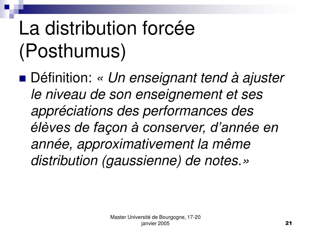 La distribution forcée (Posthumus) • Définition: « Un enseignant tend à ajuster le niveau de son enseignement et ses appréciations des performances des élèves de façon à conserver, d’année en année, approximativement la même distribution (gaussienne) de notes.» Master Université de Bourgogne, 17-20 janvier 2005