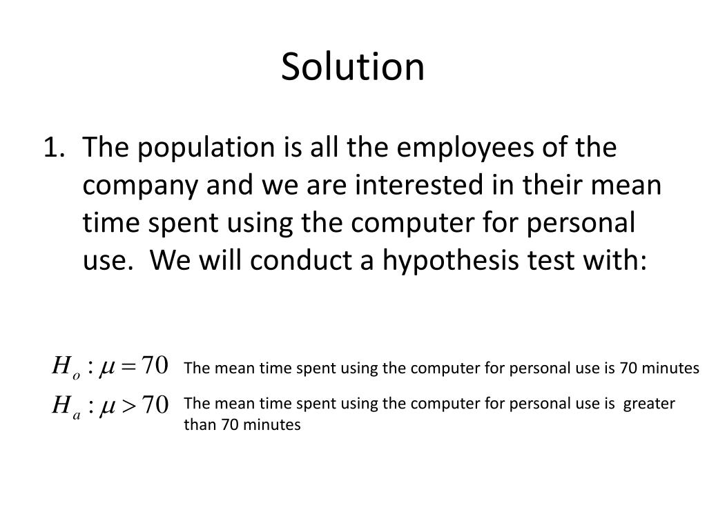Solution • The population is all the employees of the company and we are interested in their mean time spent using the computer for personal use. We will conduct a hypothesis test with: The mean time spent using the computer for personal use is 70 minutes The mean time spent using the computer for personal use is greater than 70 minutes