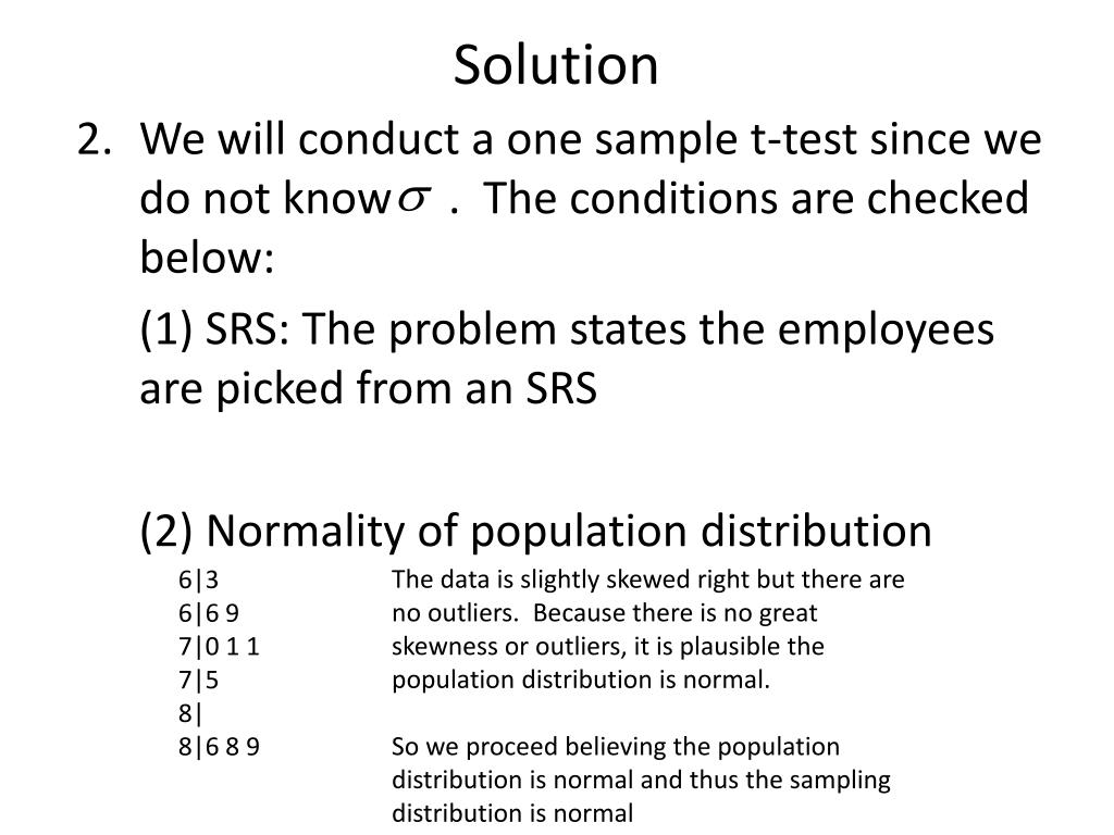 Solution • We will conduct a one sample t-test since we do not know . The conditions are checked below: (1) SRS: The problem states the employees are picked from an SRS (2) Normality of population distribution The data is slightly skewed right but there are no outliers. Because there is no great skewness or outliers, it is plausible the population distribution is normal. So we proceed believing the population distribution is normal and thus the sampling distribution is normal 6|3 6|6 9 7|0 1 1 7|5 8| 8|6 8 9