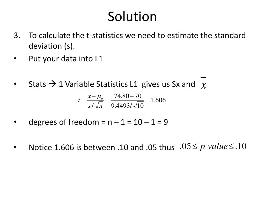 Solution • To calculate the t-statistics we need to estimate the standard deviation (s). • Put your data into L1 • Stats 1 Variable Statistics L1 gives us Sx and • degrees of freedom = n – 1 = 10 – 1 = 9 • Notice 1.606 is between .10 and .05 thus