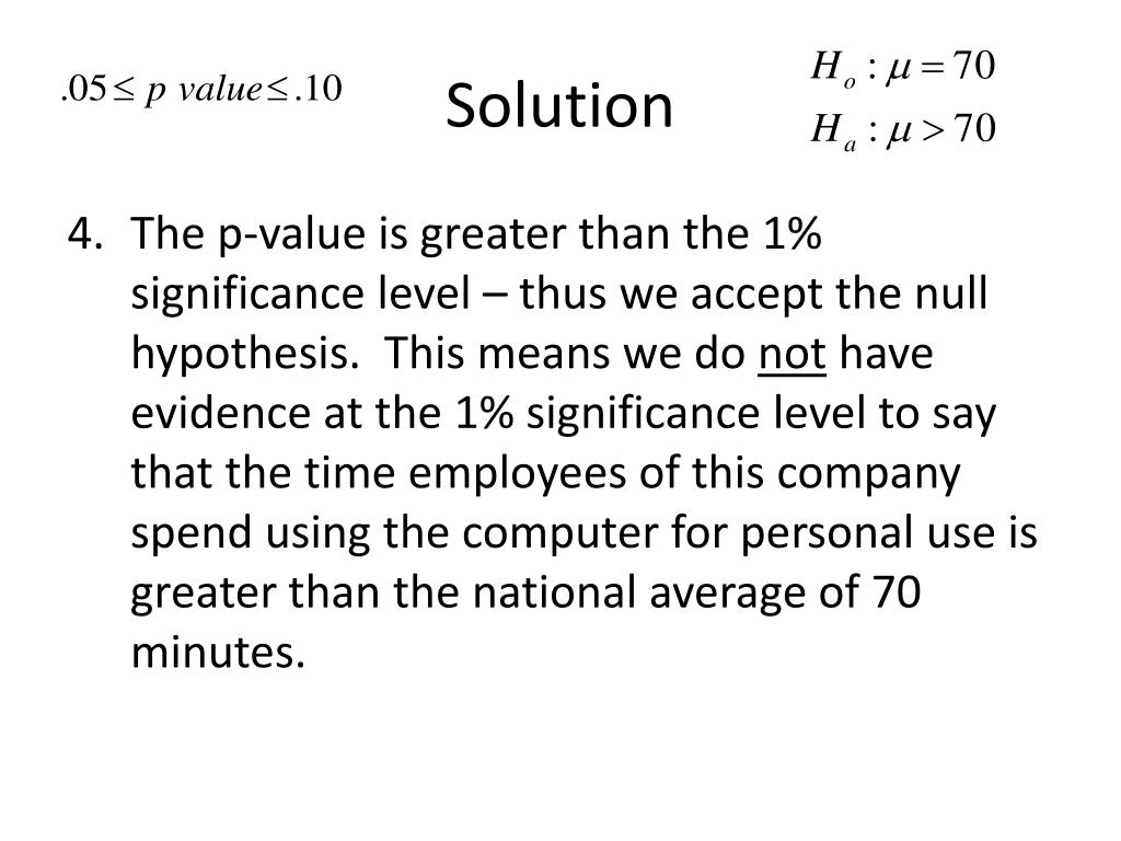 Solution • The p-value is greater than the 1% significance level – thus we accept the null hypothesis. This means we do not have evidence at the 1% significance level to say that the time employees of this company spend using the computer for personal use is greater than the national average of 70 minutes.