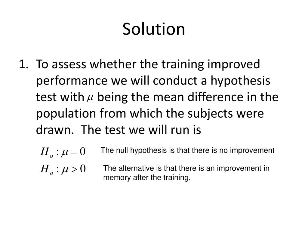 Solution • To assess whether the training improved performance we will conduct a hypothesis test with being the mean difference in the population from which the subjects were drawn. The test we will run is The null hypothesis is that there is no improvement The alternative is that there is an improvement in memory after the training.
