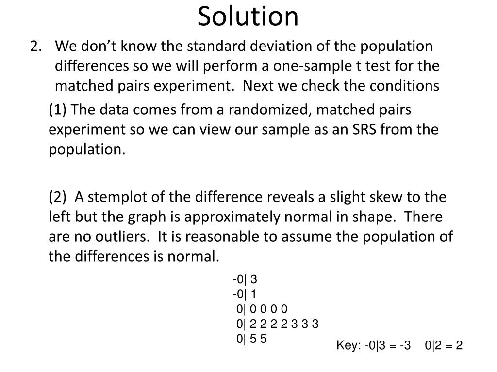 Solution • We don’t know the standard deviation of the population differences so we will perform a one-sample t test for the matched pairs experiment. Next we check the conditions (1) The data comes from a randomized, matched pairs experiment so we can view our sample as an SRS from the population. (2) A stemplot of the difference reveals a slight skew to the left but the graph is approximately normal in shape. There are no outliers. It is reasonable to assume the population of the differences is normal. -0| 3 -0| 1 0| 0 0 0 0 0| 2 2 2 2 3 3 3 0| 5 5 Key: -0|3 = -3 0|2 = 2