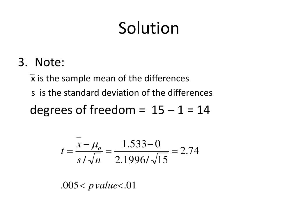 Solution • Note: x is the sample mean of the differences s is the standard deviation of the differences degrees of freedom = 15 – 1 = 14