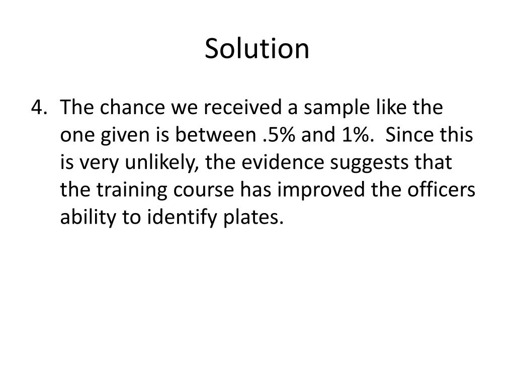 Solution • The chance we received a sample like the one given is between .5% and 1%. Since this is very unlikely, the evidence suggests that the training course has improved the officers ability to identify plates.