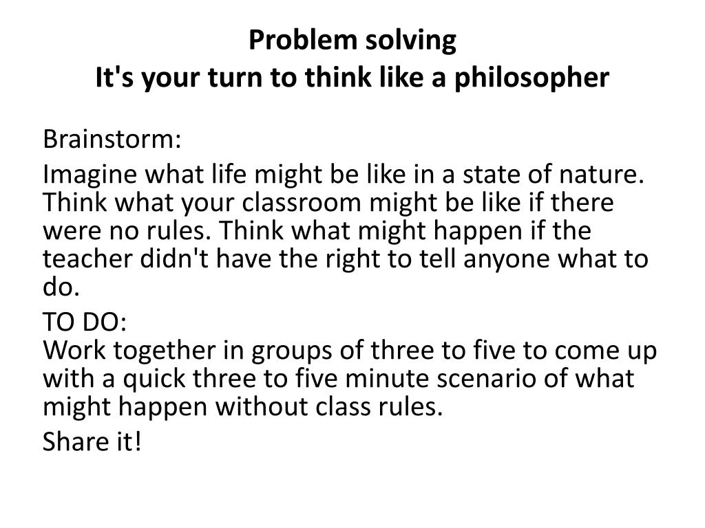 Problem solvingIt's your turn to think like a philosopher Brainstorm: Imagine what life might be like in a state of nature. Think what your classroom might be like if there were no rules. Think what might happen if the teacher didn't have the right to tell anyone what to do. TO DO:Work together in groups of three to five to come up with a quick three to five minute scenario of what might happen without class rules. Share it!