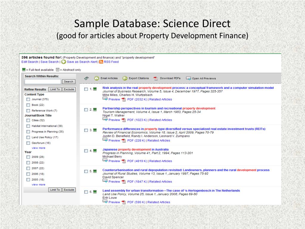 Sample Database: Science Direct(good for articles about Property Development Finance)