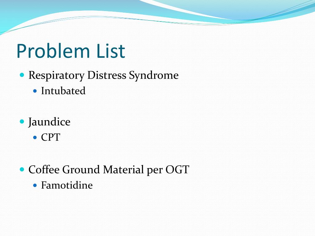 Problem List • Respiratory Distress Syndrome • Intubated • Jaundice • CPT • Coffee Ground Material per OGT • Famotidine