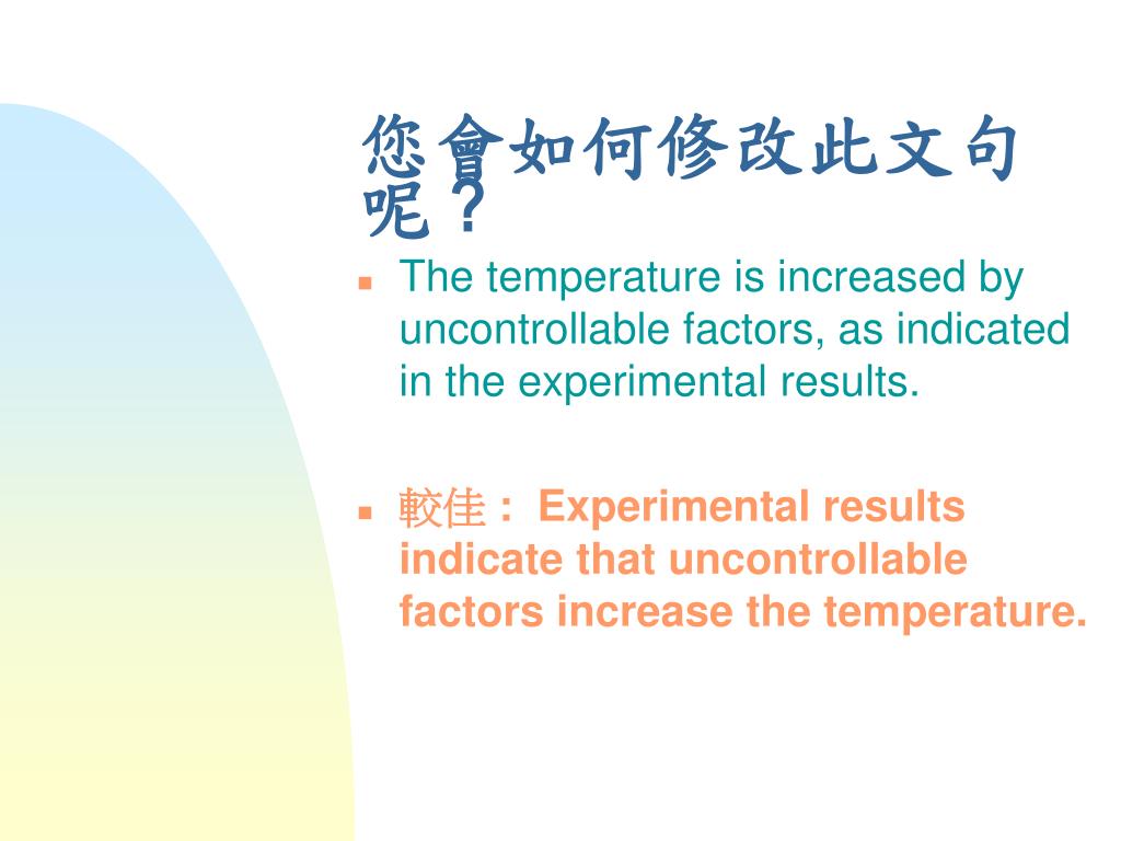 您會如何修改此文句呢 ? • The temperature is increased by uncontrollable factors, as indicated in the experimental results. • 較佳 : Experimental results indicate that uncontrollable factors increase the temperature.