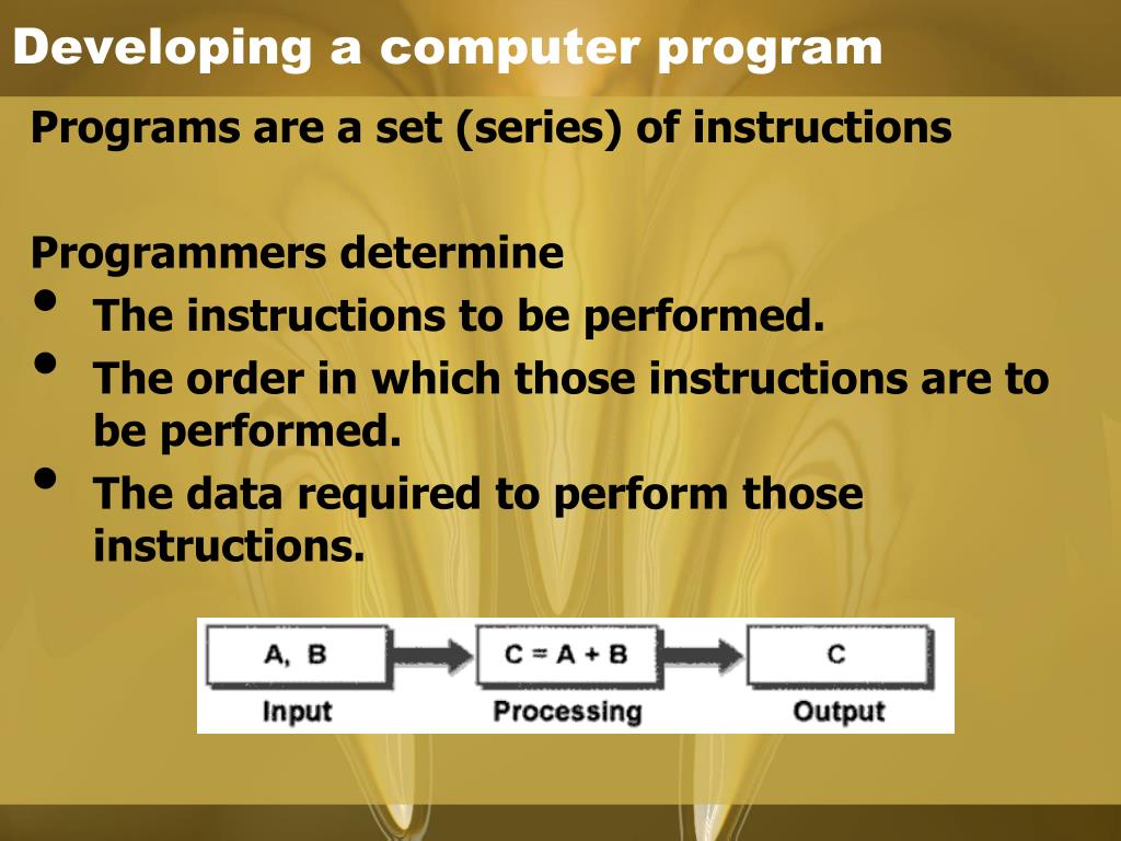 Developing a computer program • Programs are a set (series) of instructions • Programmers determine • The instructions to be performed. • The order in which those instructions are to be performed. • The data required to perform those instructions.