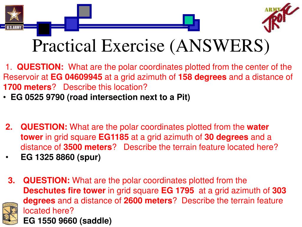 Practical Exercise (ANSWERS) • 1. QUESTION: What are the polar coordinates plotted from the center of the Reservoir at EG 04609945 at a grid azimuth of 158 degrees and a distance of 1700 meters?Describe this location? • EG 0525 9790 (road intersection next to a Pit) • QUESTION: What are the polar coordinates plotted from the water tower in grid square EG1185 at a grid azimuth of 30 degrees and a distance of 3500 meters?Describe the terrain feature located here? • EG 1325 8860 (spur) • QUESTION: What are the polar coordinates plotted from the Deschutes fire tower in grid square EG 1795 at a grid azimuth of 303 degrees and a distance of 2600 meters?Describe the terrain feature located here? • EG 1550 9660 (saddle)