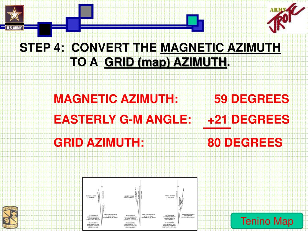 STEP 4: CONVERT THE MAGNETIC AZIMUTH TO A GRID AZIMUTH. MAGNETIC AZIMUTH: 79 DEGREES EASTERLY G-M ANGLE: +21 DEGREES GRID AZIMUTH: 100 DEGREES