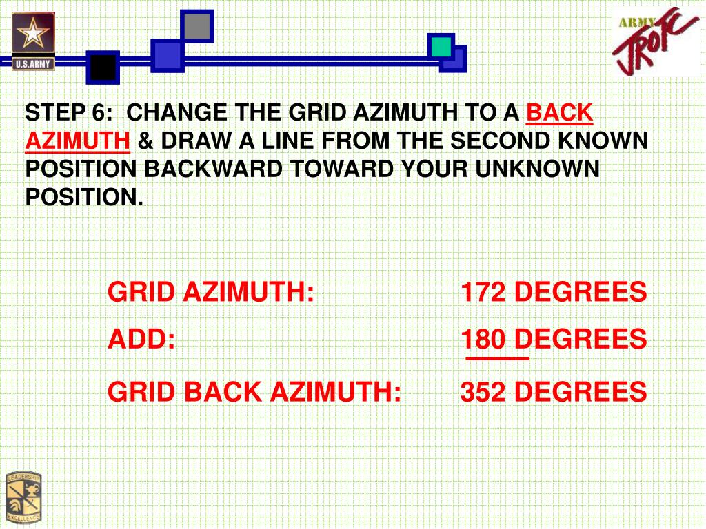 STEP 6: CHANGE THE GRID AZIMUTH TO A BACK AZIMUTH & DRAW A LINE FROM THE SECOND KNOWN POSITION BACKWARD TOWARD YOUR UNKNOWN POSITION. GRID AZIMUTH: 172 DEGREES ADD: 180 DEGREES GRID BACK AZIMUTH: 352 DEGREES