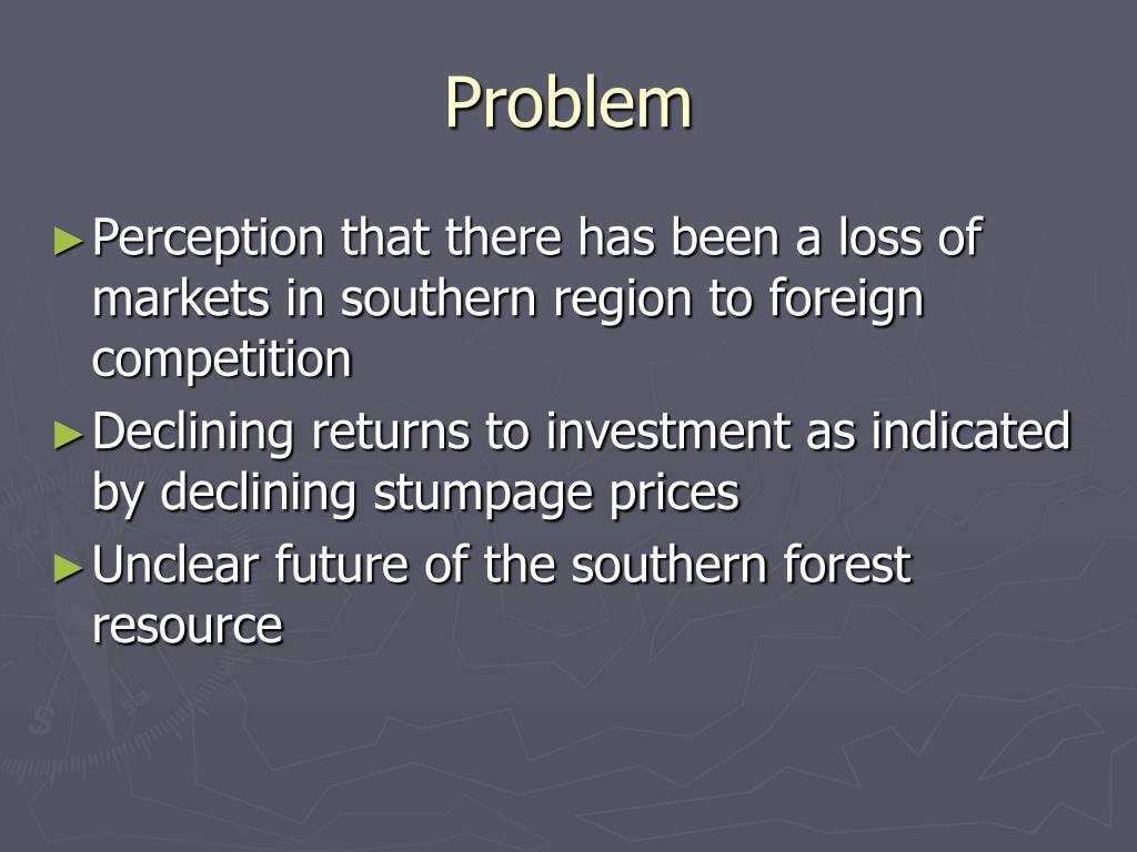 Problem • Perception that there has been a loss of markets in southern region to foreign competition • Declining returns to investment as indicated by declining stumpage prices • Unclear future of the southern forest resource