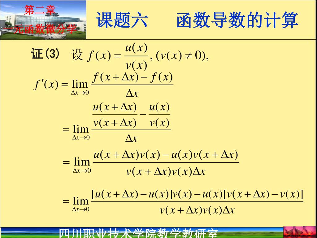 【 授课时数 】 总时数 : 6 学时. 【 学习目标 】 1 、知道函数导数的四则运算法则,复合函数的求导法则、反函数的求则法则和导数的基本公式; 2 、会用法则和公式求初等函数、幂指函数、隐函数和参数方程的导数; 3 、会求曲线在一点处的切线和法线方程。. 【 重、难点 】 重点 :导数的四则运算法则,复合函数的求导法则和导数的基本公式,通过导数的定义和极限的四则运算法则引出。 难点 :可导函数积或商的求导、复合函数的求导和隐函数的求导,由实例讲解方法。. 一、函数导数的四则运算. 1. 函数导数的四则运算法则. 定理. 证 (3). 2. 推论.