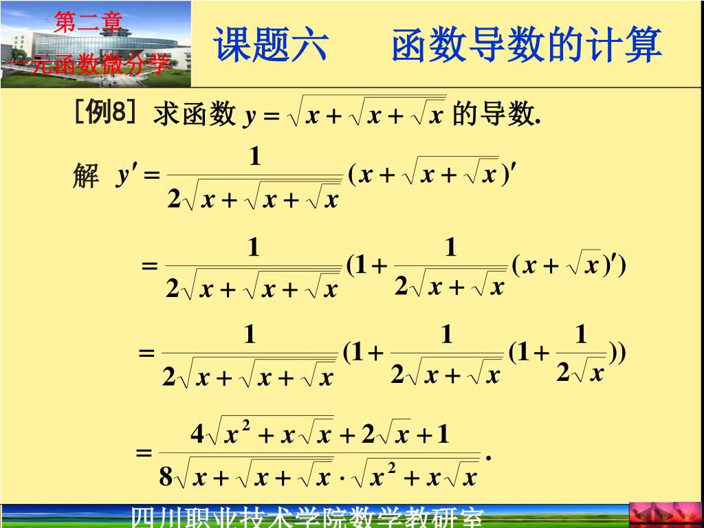 (三)复合函数的求导法则 利用上述导数基本公式、四则运算法则和复合函数的求导法则,初等函数求导问题可完全解决. 注意:初等函数的导数仍为初等函数.