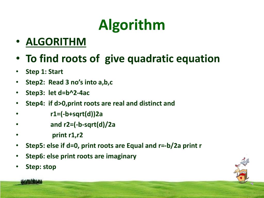 Algorithm • ALGORITHM • To find roots of give quadratic equation • Step 1: Start • Step2: Read 3 no’s into a,b,c • Step3: let d=b^2-4ac • Step4: if d>0,print roots are real and distinct and • r1=(-b+sqrt(d))2a • and r2=(-b-sqrt(d)/2a • print r1,r2 • Step5: else if d=0, print roots are Equal and r=-b/2a print r • Step6: else print roots are imaginary • Step: stop