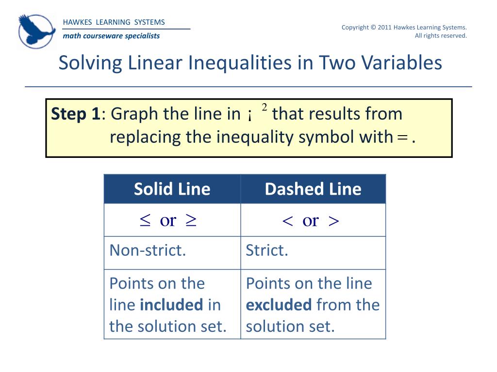 Hawkes Learning Systems: College Algebra. 3.5: Linear Inequalities in Two Variables. Objectives. Solving linear inequalities in two variables. Solving linear inequalities joined by “and” or “or”. Applications of the term regions of constraint. . Linear Inequalities in Two Variables.