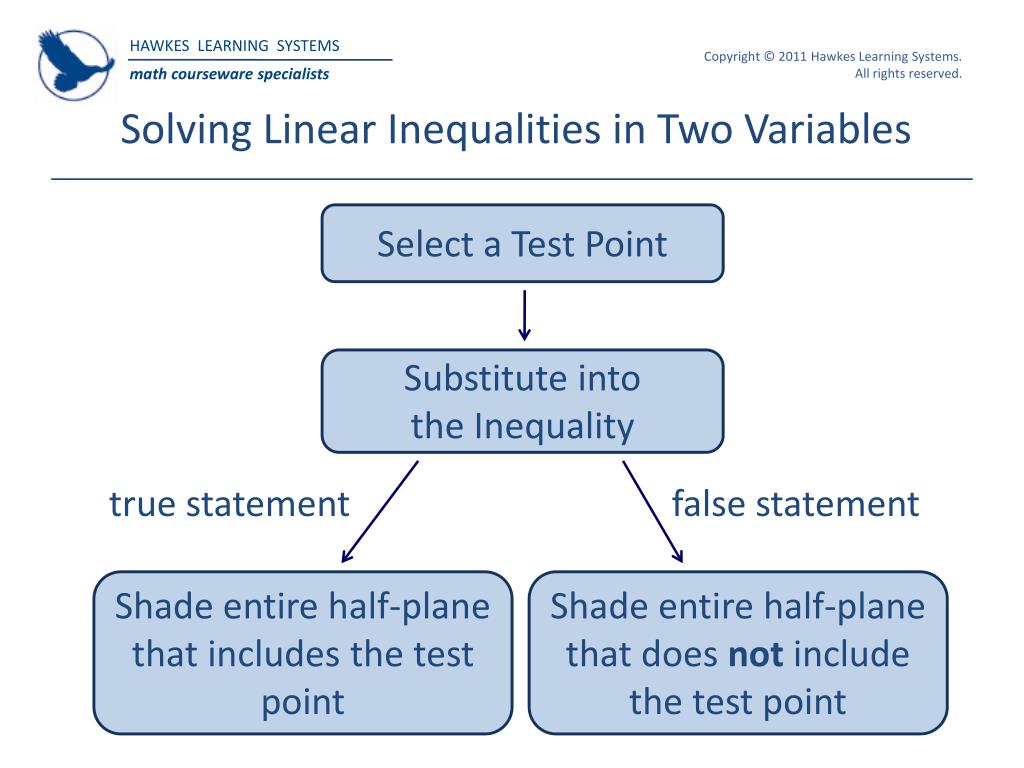 Solving Linear Inequalities in Two Variables Select a Test Point Substitute into the Inequality true statement false statement Shade entire half-plane that includes the test point Shade entire half-plane that does not include the test point