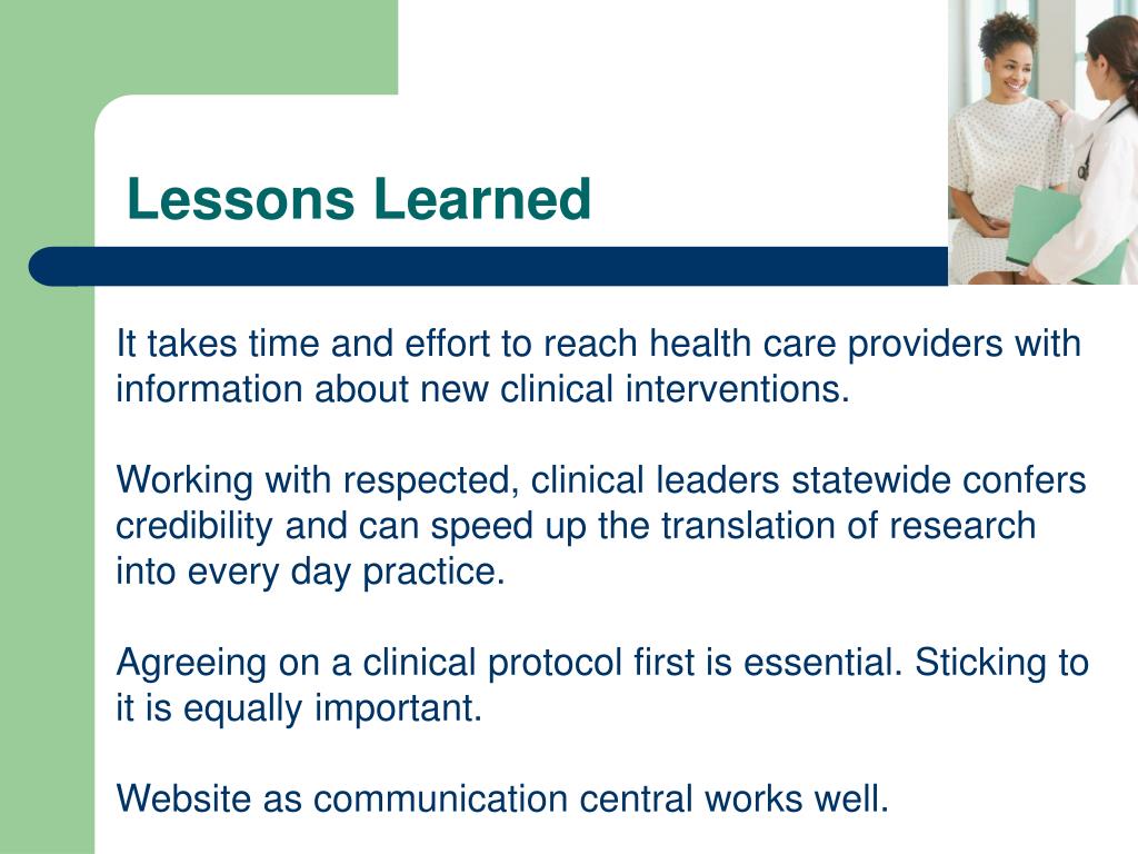 Lessons Learned It takes time and effort to reach health care providers with information about new clinical interventions. Working with respected, clinical leaders statewide confers credibility and can speed up the translation of research into every day practice. Agreeing on a clinical protocol first is essential. Sticking to it is equally important. Website as communication central works well.