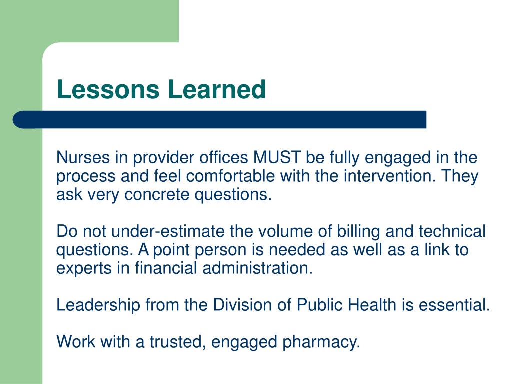 Lessons Learned Nurses in provider offices MUST be fully engaged in the process and feel comfortable with the intervention. They ask very concrete questions. Do not under-estimate the volume of billing and technical questions. A point person is needed as well as a link to experts in financial administration. Leadership from the Division of Public Health is essential. Work with a trusted, engaged pharmacy.