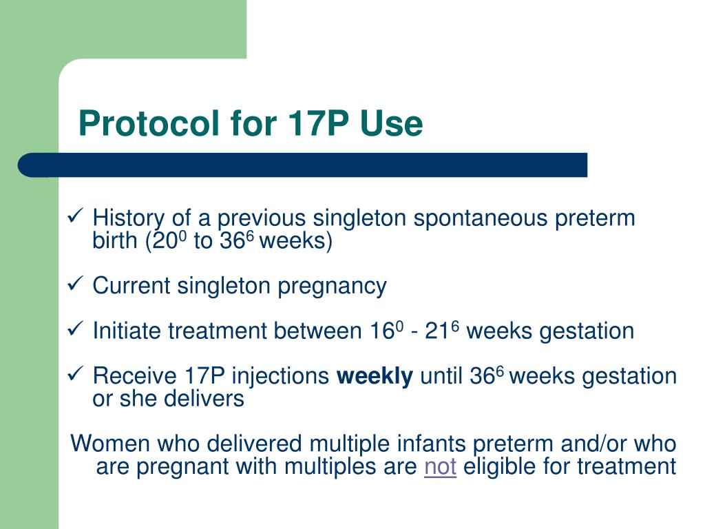 Protocol for 17P Use • History of a previous singleton spontaneous preterm birth (200 to 366 weeks) • Current singleton pregnancy • Initiate treatment between 160 - 216 weeks gestation • Receive 17P injections weekly until 366 weeks gestation or she delivers Women who delivered multiple infants preterm and/or who are pregnant with multiples are not eligible for treatment