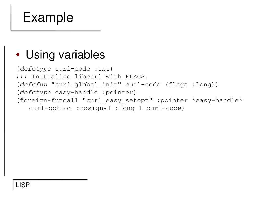 Example • Using variables (defctype curl-code :int) ;;; Initialize libcurl with FLAGS. (defcfun "curl_global_init" curl-code (flags :long)) (defctype easy-handle :pointer) (foreign-funcall "curl_easy_setopt" :pointer *easy-handle* curl-option :nosignal :long 1 curl-code)