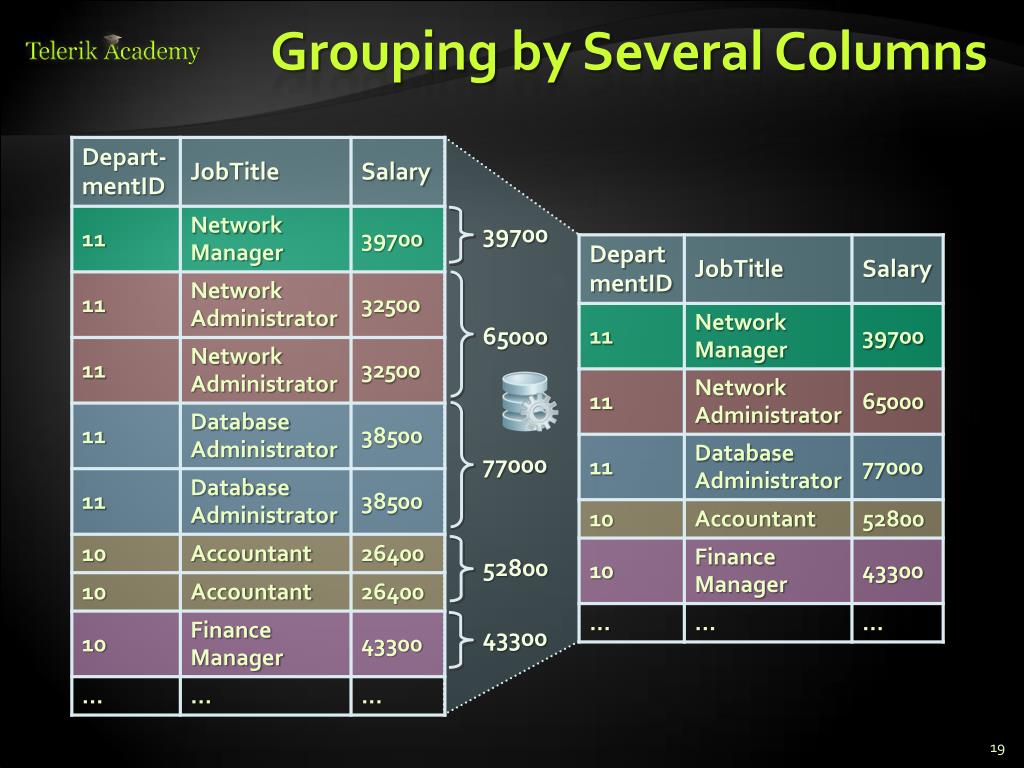 Grouping by Several Columns – Example • Example of grouping data by several columns: SELECT DepartmentID, JobTitle, SUM(Salary) as Salaries, COUNT(*) as Count FROM Employees GROUP BY DepartmentID, JobTitle