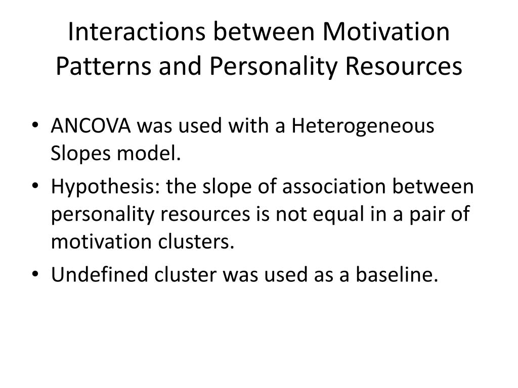 Interactions between Motivation Patterns and Personality Resources • ANCOVA was used with a Heterogeneous Slopes model. • Hypothesis: the slope of association between personality resources is not equal in a pair of motivation clusters. • Undefined cluster was used as a baseline.