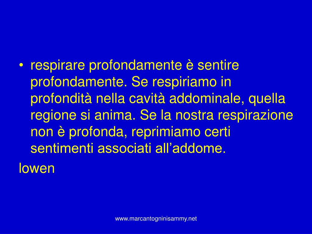 respirare profondamente è sentire profondamente. Se respiriamo in profondità nella cavità addominale, quella regione si anima. Se la nostra respirazione non è profonda, reprimiamo certi sentimenti associati all’addome. lowen www.marcantogninisammy.net