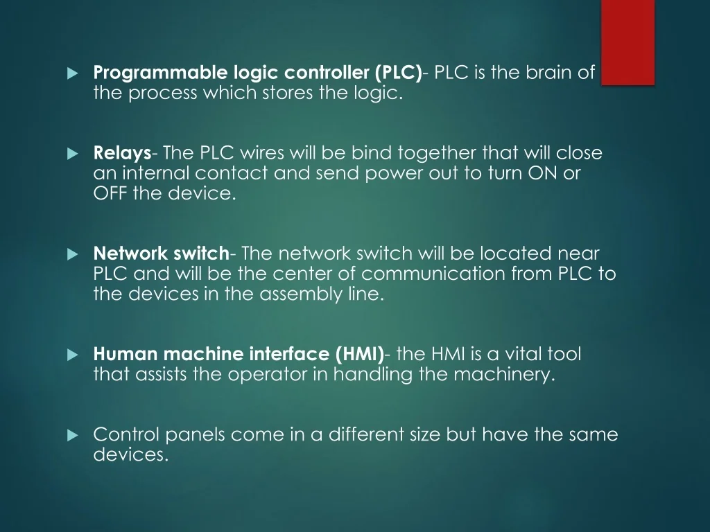 Programmable logic controller (PLC)- PLC is the brain of the process which stores the logic. • Relays- The PLC wires will be bind together that will close an internal contact and send power out to turn ON or OFF the device. • Network switch- The network switch will be located near PLC and will be the center of communication from PLC to the devices in the assembly line. • Human machine interface (HMI)- the HMI is a vital tool that assists the operator in handling the machinery. • Control panels come in a different size but have the same devices.