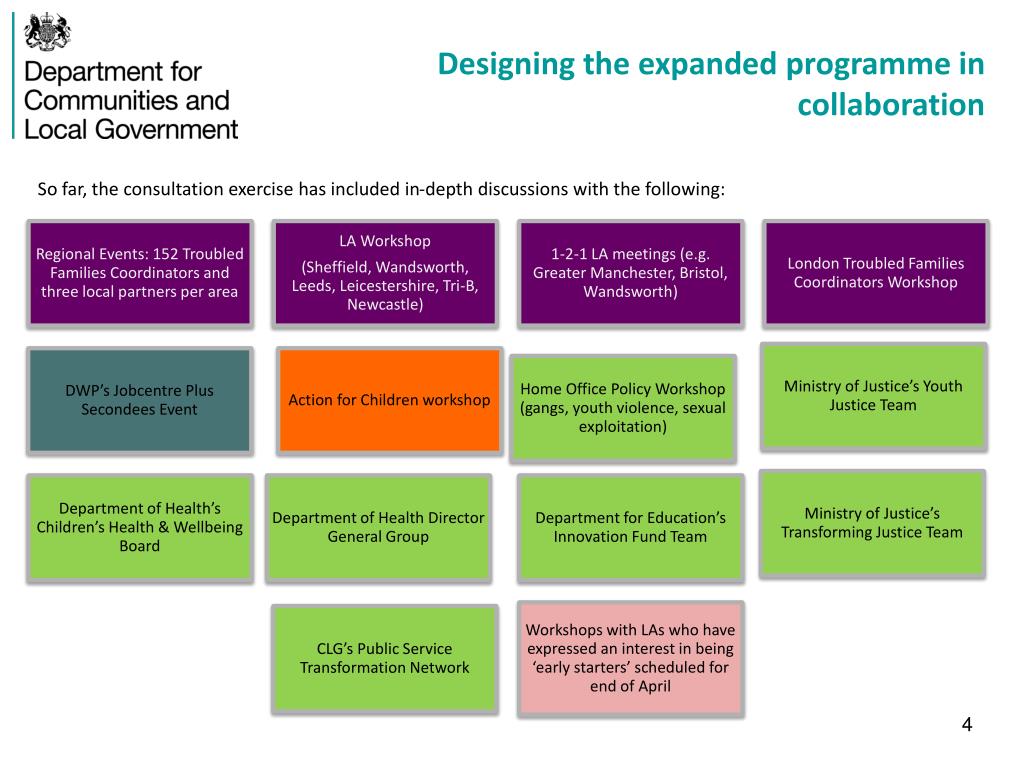 The Expanded Troubled Families Programme In Spending Round 2013, the Government announced: • 5 year extension of the Troubled Families Programme from 2015 • £200m in 2015/16 (1st of 5 years’ intended investment) • Additional 400,000 families to benefit As part of the Budget 2014, the Government announced: • Will bring forward by one year the next stage of the Programme, which means up to 40,000 families will be able to get support one year earlier than planned. • First group of ‘early starters’ to begin in July 2014 – working with them over the coming months to design the detail. • The problems targeted by the current programme – youth crime, anti-social behaviour, poor school attendance and unemployment - remain relevant. The expanded programme will look to focus on families with a broader range of problems. These include families who are: • affected by family violence • with vulnerable children, and • with a range of mental and physical health problems.