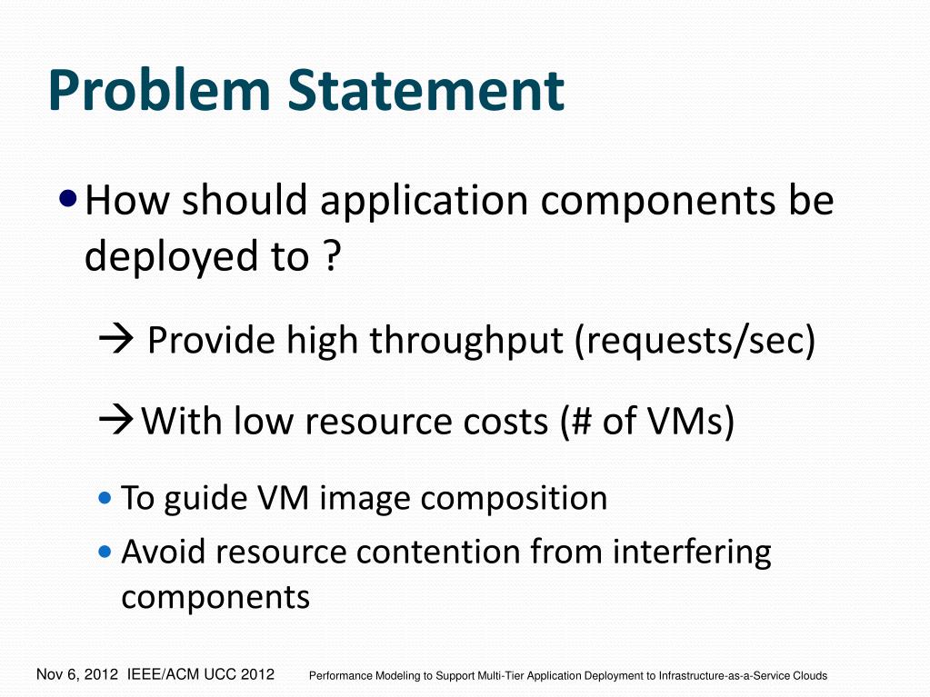 Problem Statement • How should application components be deployed to ? Provide high throughput (requests/sec) With low resource costs (# of VMs) • To guide VM image composition • Avoid resource contention from interfering components