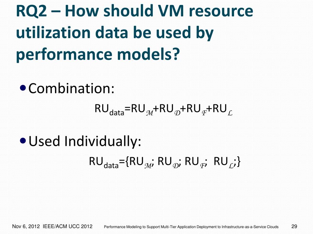 RQ2 – How should VM resource utilization data be used by performance models? • Combination: RUdata=RUM+RUD+RUF+RUL • Used Individually: RUdata={RUM; RUD; RUF; RUL;}