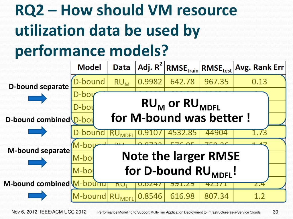 RQ2 – How should VM resource utilization data be used by performance models? RUM or RUMDFL for M-bound was better ! Treating VM data separately for D-bound was better ! Note the larger RMSE for D-bound RUMDFL! M-bound combined D-bound combined M-bound separate D-bound separate