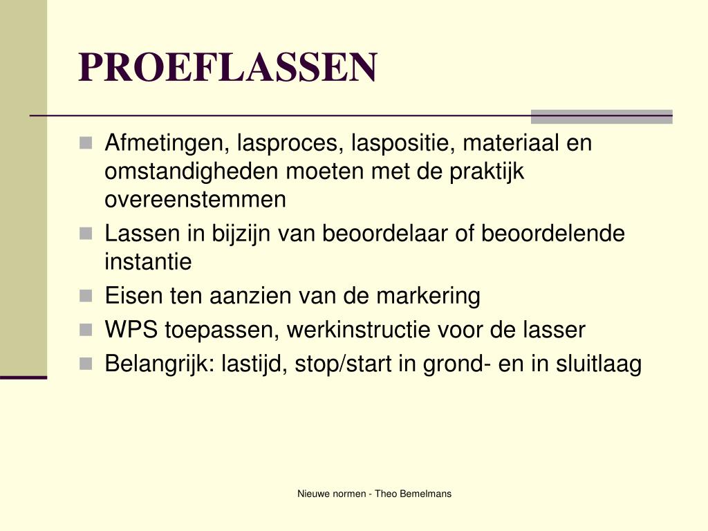 PROEFLASSEN • Afmetingen, lasproces, laspositie, materiaal en omstandigheden moeten met de praktijk overeenstemmen • Lassen in bijzijn van beoordelaar of beoordelende instantie • Eisen ten aanzien van de markering • WPS toepassen, werkinstructie voor de lasser • Belangrijk: lastijd, stop/start in grond- en in sluitlaag Nieuwe normen - Theo Bemelmans