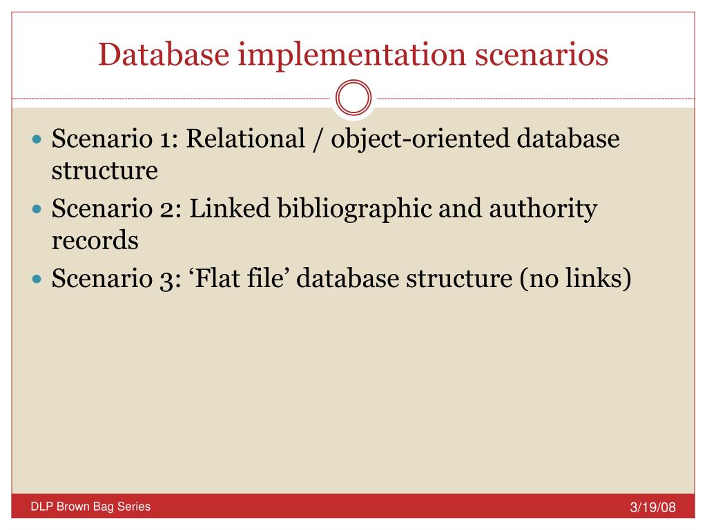 Database implementation scenarios • Scenario 1: Relational / object-oriented database structure • Scenario 2: Linked bibliographic and authority records • Scenario 3: ‘Flat file’ database structure (no links) DLP Brown Bag Series