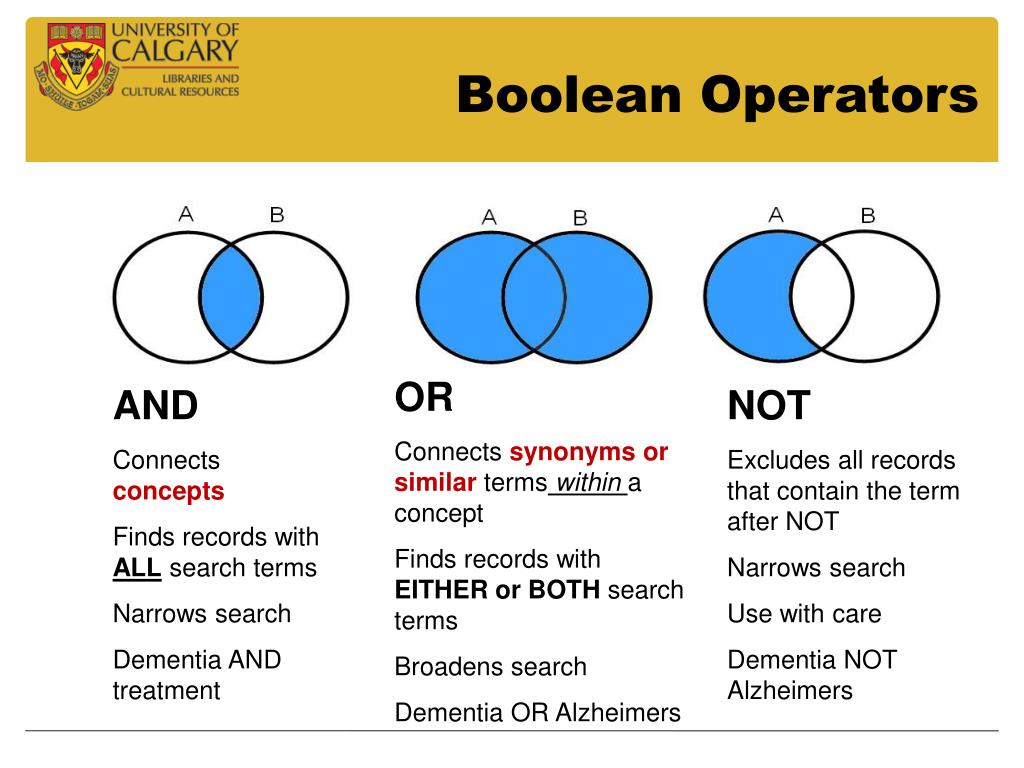 Boolean Operators OR Connects synonyms or similarterms within a concept Finds records with EITHER or BOTH search terms Broadens search Dementia OR Alzheimers AND Connects concepts Finds records with ALL search terms Narrows search Dementia AND treatment NOT Excludes all records that contain the term after NOT Narrows search Use with care Dementia NOT Alzheimers