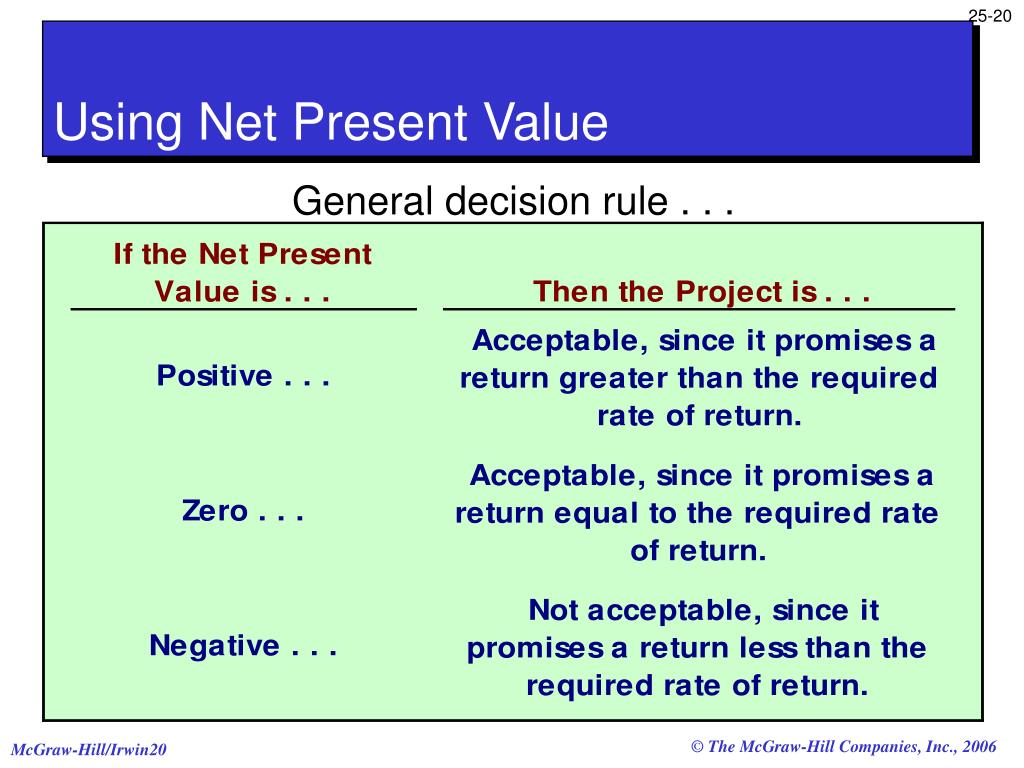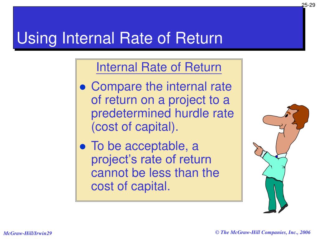 Internal Rate of Return Compare the internal rateof return on a project to a predetermined hurdle rate (cost of capital). To be acceptable, a project’s rate of return cannot be less than thecost of capital. Using Internal Rate of Return