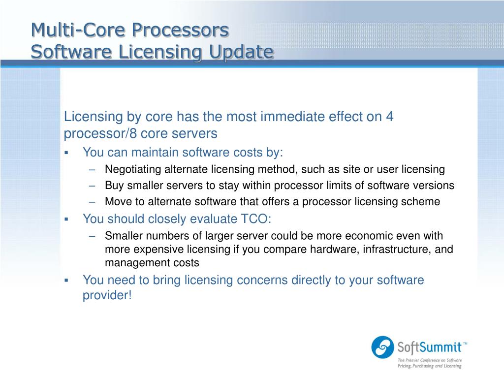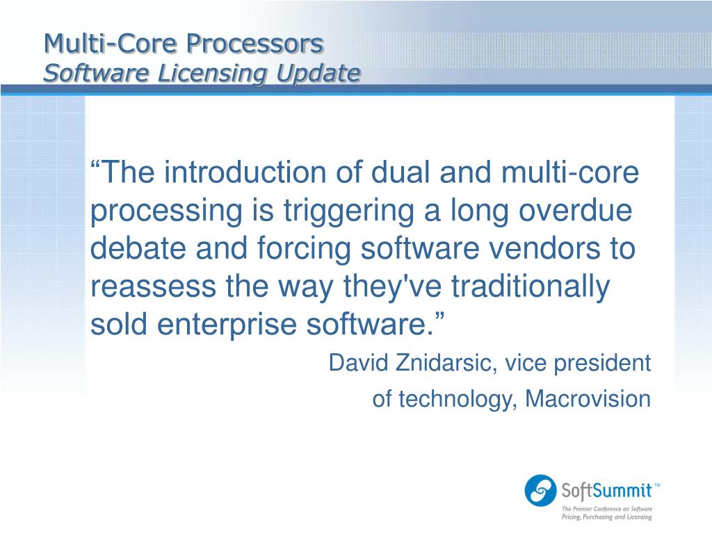 Multi-Core Processors Software Licensing Update “The introduction of dual and multi-core processing is triggering a long overdue debate and forcing software vendors to reassess the way they've traditionally sold enterprise software.” David Znidarsic, vice president of technology, Macrovision