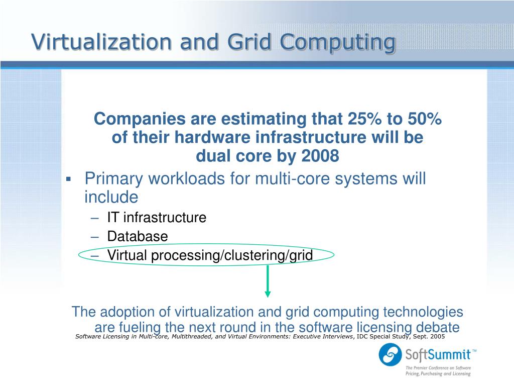 Virtualization and Grid Computing Companies are estimating that 25% to 50% of their hardware infrastructure will be dual core by 2008 • Primary workloads for multi-core systems will include • IT infrastructure • Database • Virtual processing/clustering/grid The adoption of virtualization and grid computing technologies are fueling the next round in the software licensing debate Software Licensing in Multi-core, Multithreaded, and Virtual Environments: Executive Interviews, IDC Special Study, Sept. 2005