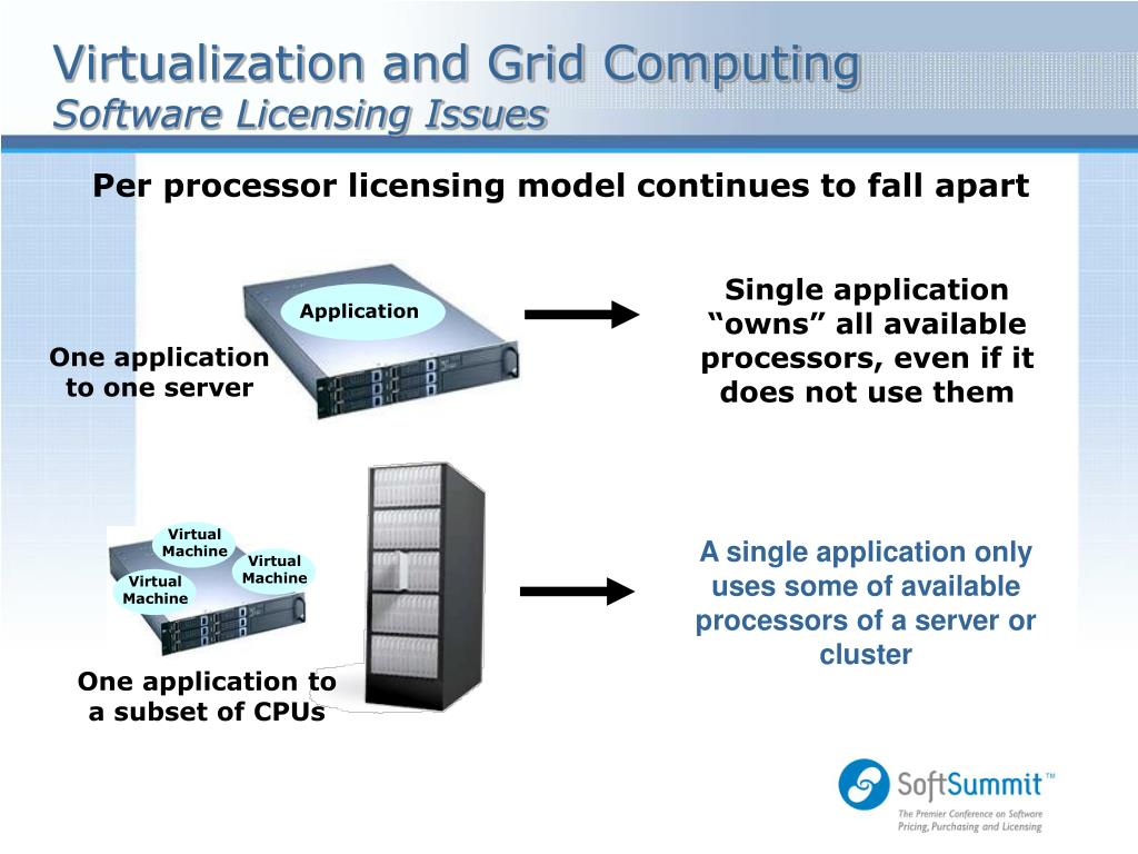 Application Virtual Machine Virtual Machine Virtual Machine Virtualization and Grid ComputingSoftware Licensing Issues Per processor licensing model continues to fall apart Single application “owns” all available processors, even if it does not use them One application to one server A single application only uses some of available processors of a server or cluster One application to a subset of CPUs