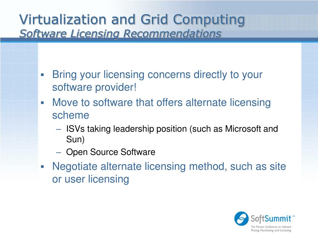 Virtualization and Grid ComputingSoftware Licensing Recommendations • Bring your licensing concerns directly to your software provider! • Move to software that offers alternate licensing scheme • ISVs taking leadership position (such as Microsoft and Sun) • Open Source Software • Negotiate alternate licensing method, such as site or user licensing