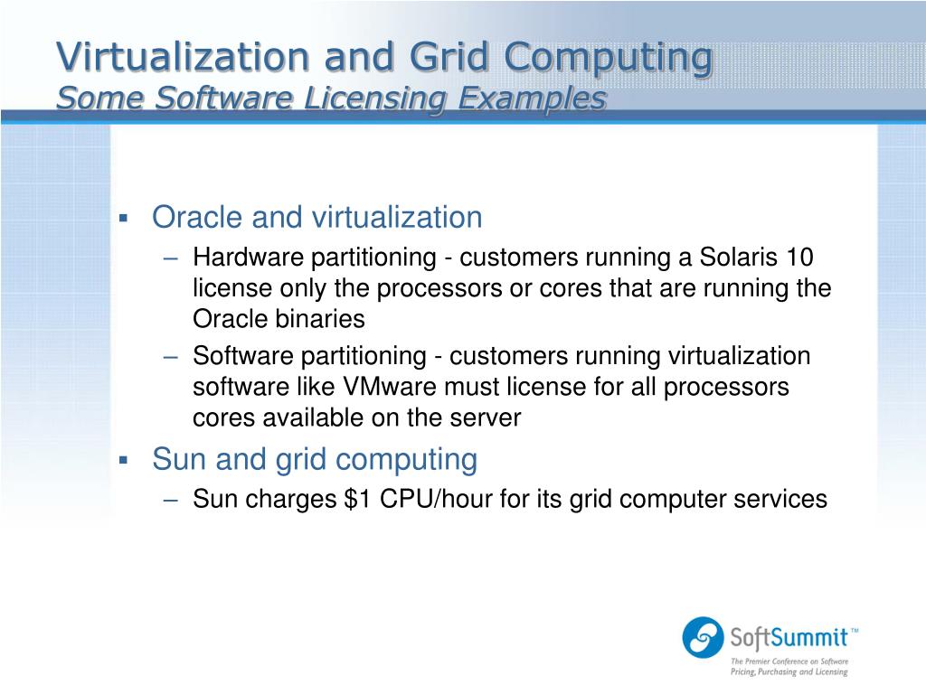 Virtualization and Grid ComputingSome Software Licensing Examples • Oracle and virtualization • Hardware partitioning - customers running a Solaris 10 license only the processors or cores that are running the Oracle binaries • Software partitioning - customers running virtualization software like VMware must license for all processors cores available on the server • Sun and grid computing • Sun charges $1 CPU/hour for its grid computer services