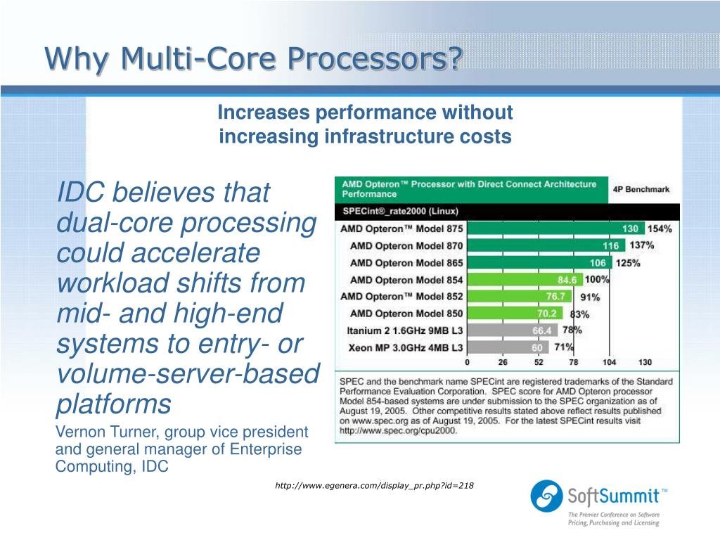 Multi-Core ProcessorsSoftware Licensing Update • Software most likely to license by processor: • IT Infrastructure • Database • Business Processing • Software least likely to license by processor: • Operating Systems • Application Development • Web Infrastructure • Collaboration • Decision Support • Virtual Processing/Grid/Cluster software Software Licensing in Multi-core, Multithreaded, and Virtual Environments: Executive Interviews, IDC Special Study, Sept. 2005