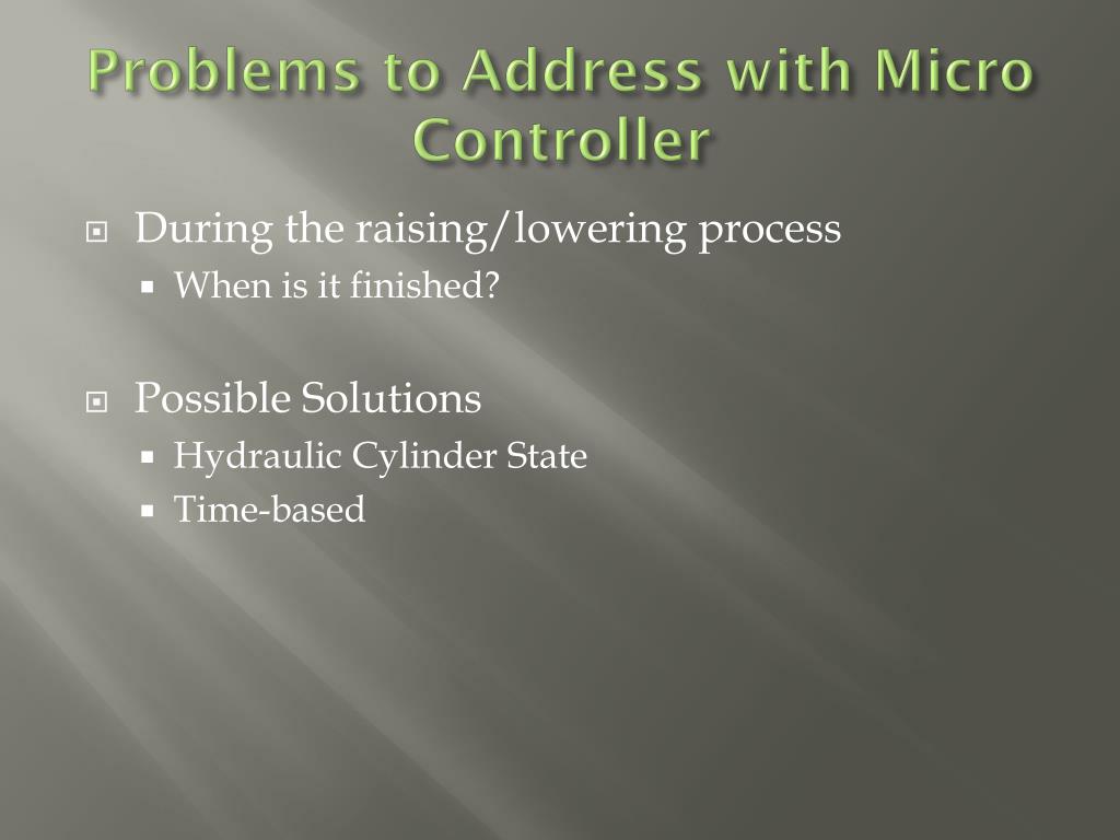 Problems to Address with Micro Controller • During the raising/lowering process • When is it finished? • Possible Solutions • Hydraulic Cylinder State • Time-based