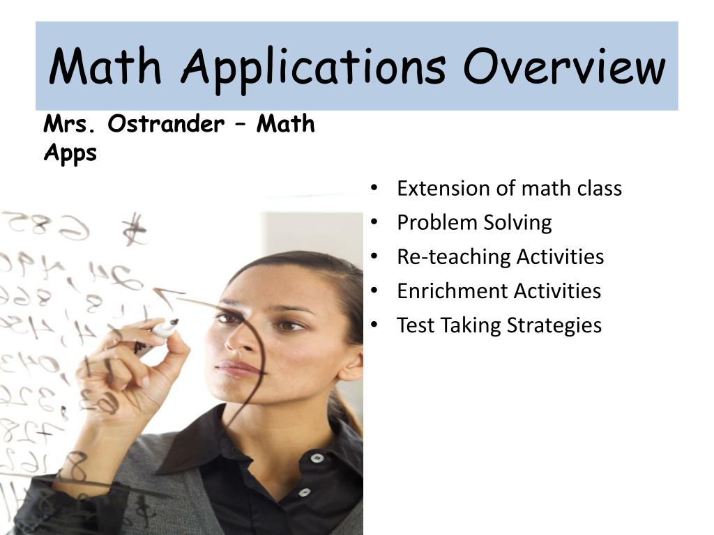 Math Applications Overview Mrs. Ostrander – Math Apps Extension of math class Problem Solving Re-teaching Activities Enrichment Activities Test Taking Strategies